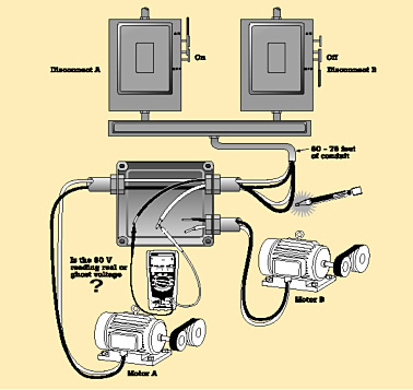 最常遇到虛假電壓的位置是配電盤(pán)中燒斷的熔斷器,現(xiàn)有導(dǎo)線管中未使用的電纜或?qū)Ь€,1 V 分支電路中或使用 1 V 控制電路來(lái)控制組裝線或輸送功能的卡盒中斷開(kāi)的地線或中線。一定大小的虛假電壓可從燒斷熔斷器的帶電側(cè)耦合到敞開(kāi)側(cè)。在建造設(shè)施或建筑物并進(jìn)行電氣接線時(shí),電工人員常常會(huì)在導(dǎo)線管中穿過(guò)額外導(dǎo)線以備將來(lái)使用。這些導(dǎo)線通常在使用之前保持不連接狀態(tài),但會(huì)發(fā)生容性耦合。對(duì)于控制電路來(lái)說(shuō),電路的位置通常臨近未使用的控制線路,因而產(chǎn)生一個(gè)虛假電壓。